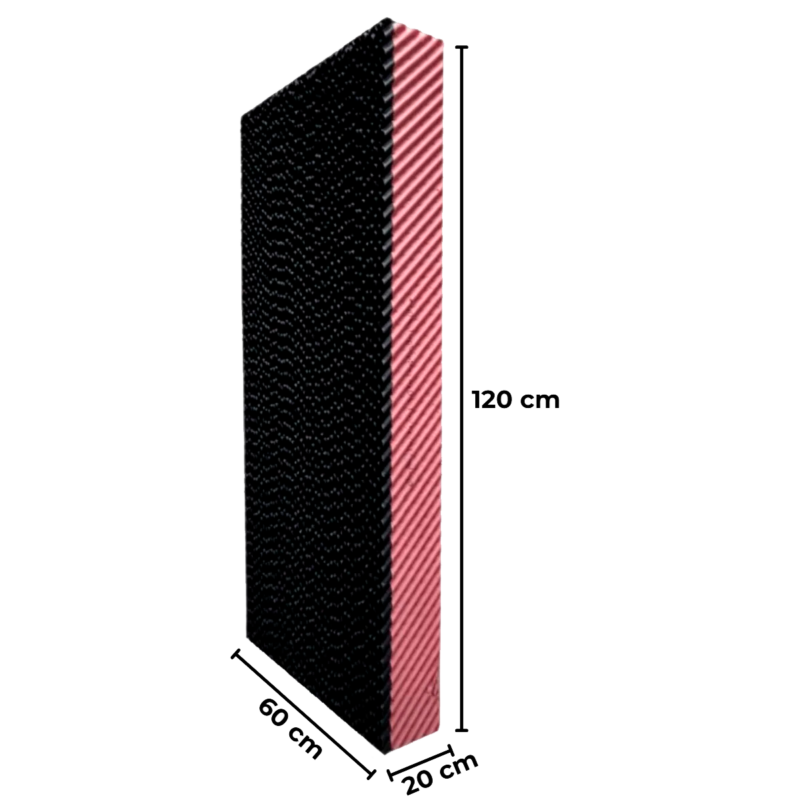 Nossa placa evaporativa apresenta uma estrutura especialmente projetada com padrão de ondulação semelhante ao de uma colmeia, otimizada para máxima eficiência na refrigeração do ar. Esta geometria específica proporciona uma área de superfície expandida, aumentando assim a superfície de contato entre o ar e a água, favorecendo a evaporação e, consequentemente, o resfriamento do ar de forma mais eficaz. Essa técnica de design permite uma transferência de calor mais rápida e eficiente, resultando em um ambiente mais fresco e confortável.